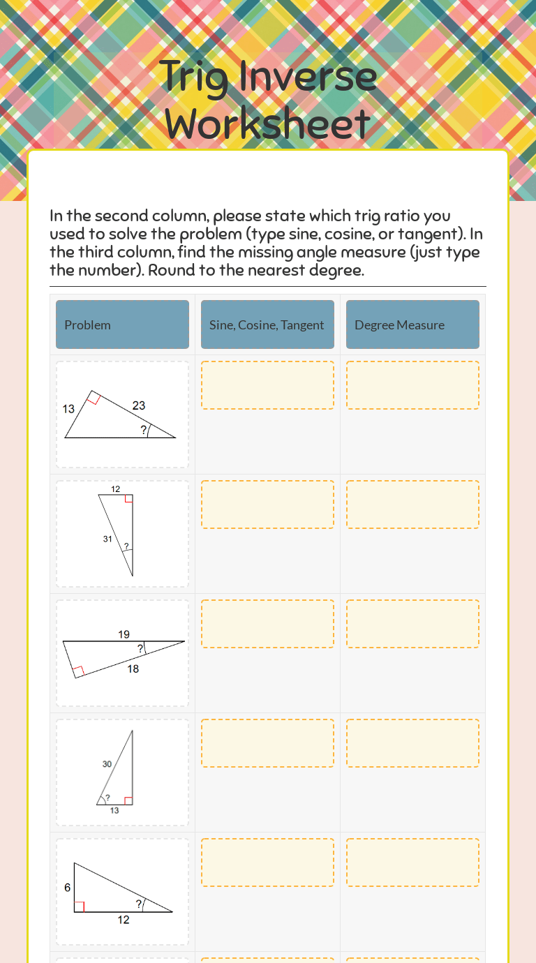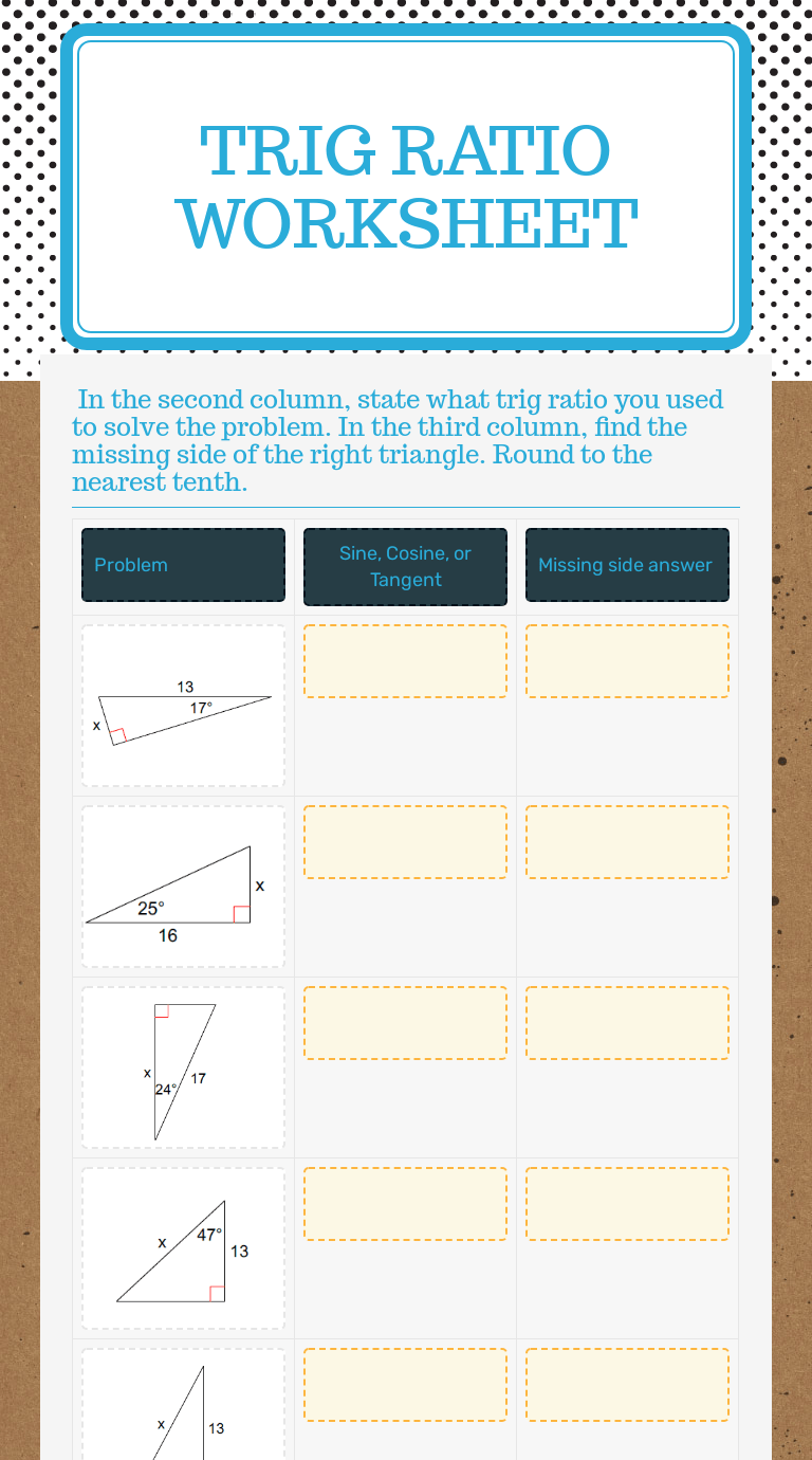 Trigonometric Ratios Notes And Practise Questions Worksheet from files.liveworksheets.com Sin cos tan trigonometry worksheet. Find the value of each trigonometric ratio. Express your answer as a fraction in lowest terms. Worksheet by kuta software llc. Sin a = cos a = tan a = where a represents the reference angle. Sin, cos, & tan ratios. Write each as a fraction and a decimal. Use the diagram to express the ratio as a fraction,.